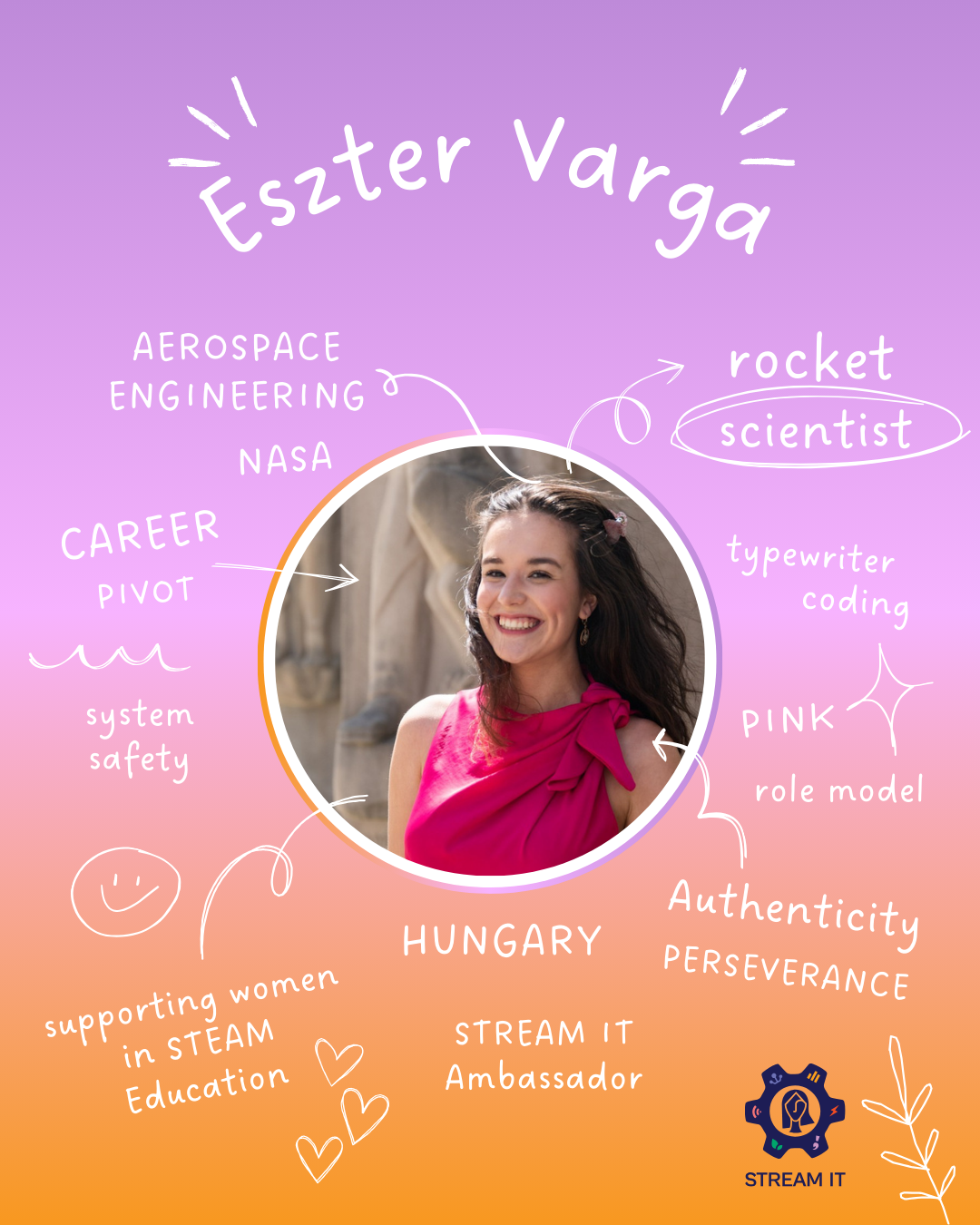 - 𝗘𝘀𝘇𝘁𝗲𝗿 𝗩𝗮𝗿𝗴𝗮 (Hungary): A Eurospace Safety Engineer and NASA-trained researcher. From wind tunnels to rocket safety, she proves you don’t have to fit a mold – or hide your personality – to reach the stars.