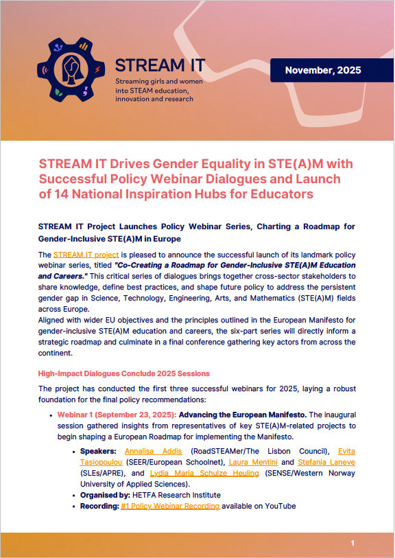 This press release elaborates on the STREAM IT project’s dual initiatives: a Policy Webinar Series that brings experts together to inform a strategic roadmap for gender-inclusive STE(A)M policy, and the launch of 14 National Inspiration Hubs (NIHs), which are dynamic online spaces providing collaborative professional development to empower educators, who are pivotal in deconstructing gender stereotypes in STE(A)M fields across Europe.